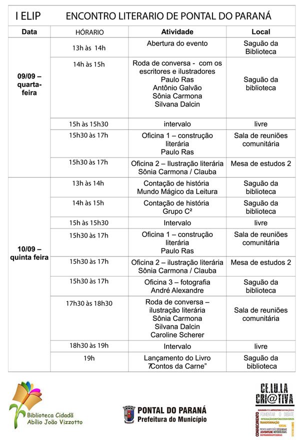 Nos dias 9 e 10 de setembro acontece na Biblioteca Cidadã Abílio João Vizzoto, em Ipanema, o 1º Encontro Literário de Pontal do Paraná.