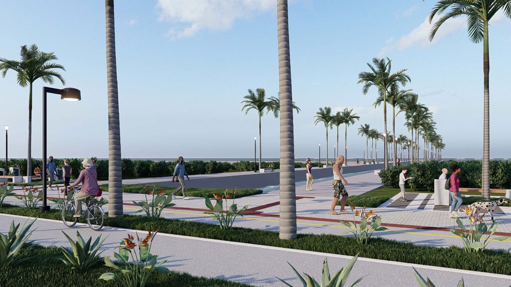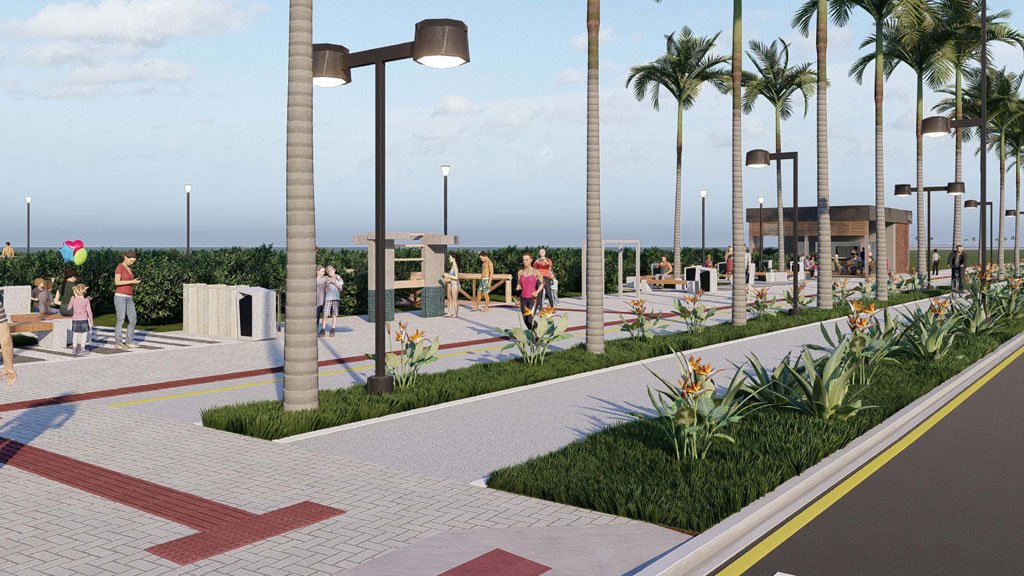 NOVA ORLA – Praticamente a metade do valor global de investimentos, na ordem de R$ 45 milhões, será aplicado na revitalização de parte da orla do município. A faixa próxima à areia da praia vai ganhar novo calçamento, pista para corrida, ciclovia, quiosques, lounges urbanos, sinalização horizontal e vertical, passarela para pedestres, dispositivos de acessibilidade e paisagismo ao longo de 3,66 quilômetros, entre os balneários de Monções e Canoas.